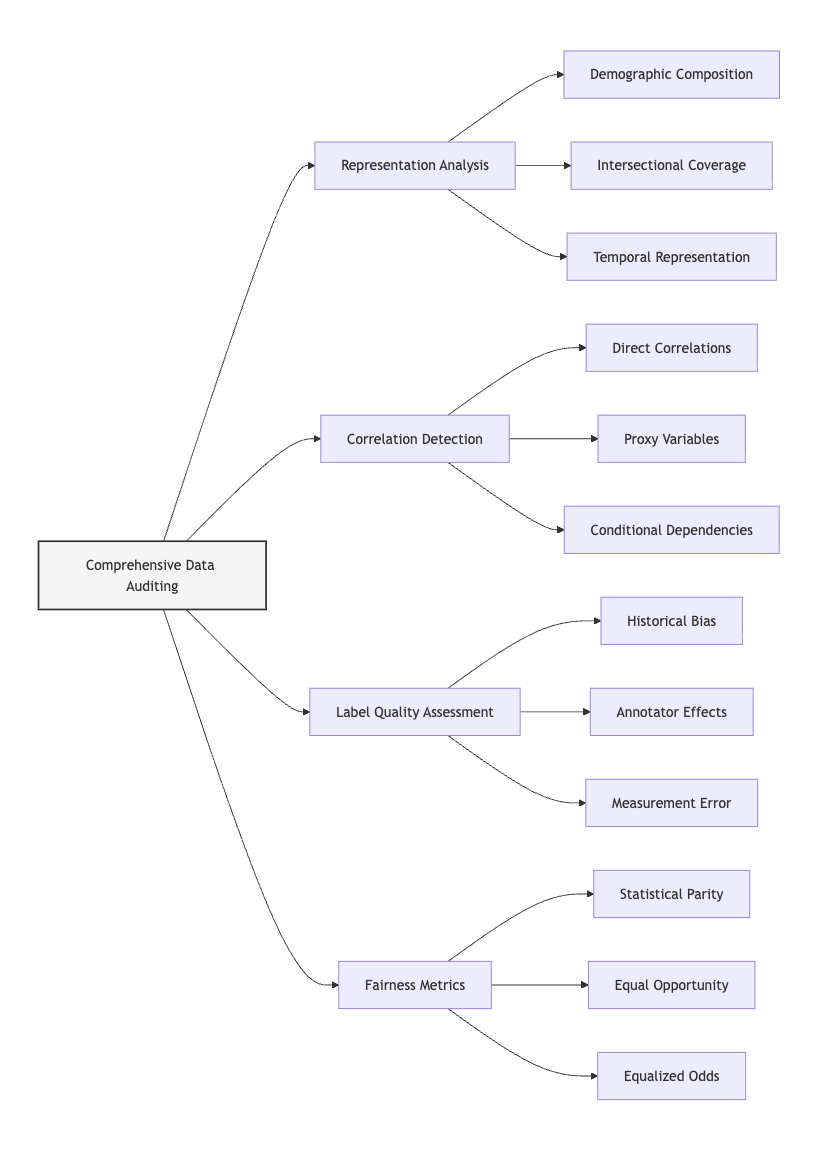 - Comprehensive data auditing is similar to a thorough medical examination that includes not just basic vitals but also blood tests, imaging, and family history. Just as a doctor needs this complete picture to make an accurate diagnosis before prescribing treatment, data scientists need comprehensive auditing to identify specific bias mechanisms before implementing fairness interventions. A superficial analysis would be like prescribing medication based only on a patient's temperature, potentially addressing symptoms without treating the underlying condition.