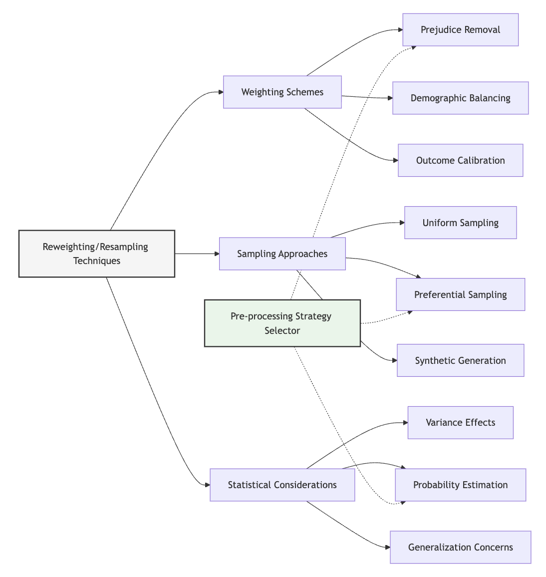 - Sampling/Reweighting: Adjusts the distribution of protected attributes to reduce their influence