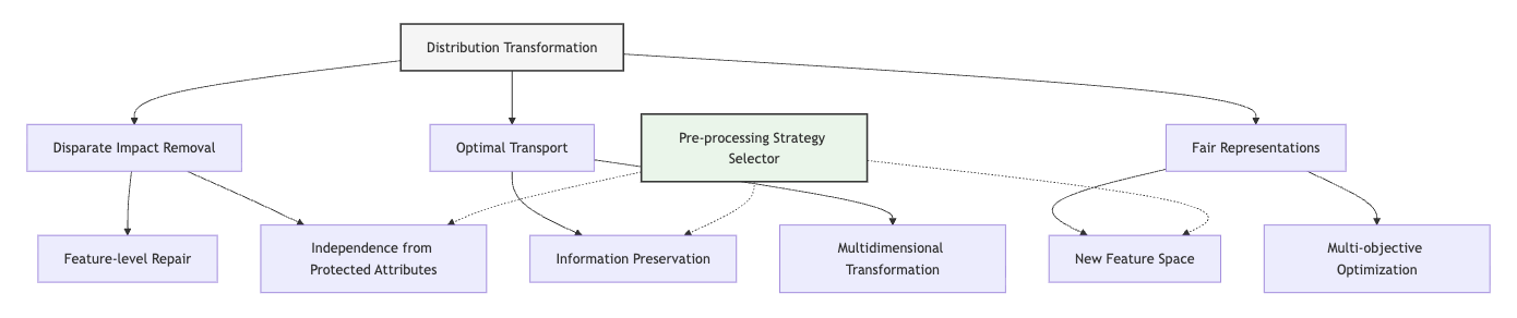 | Distribution Transformation | Disparate Impact Remover, Optimal Transport | Removing correlations between protected attributes and other features | More complex to implement; may reduce task performance | Can address complex correlation patterns across multiple attributes |