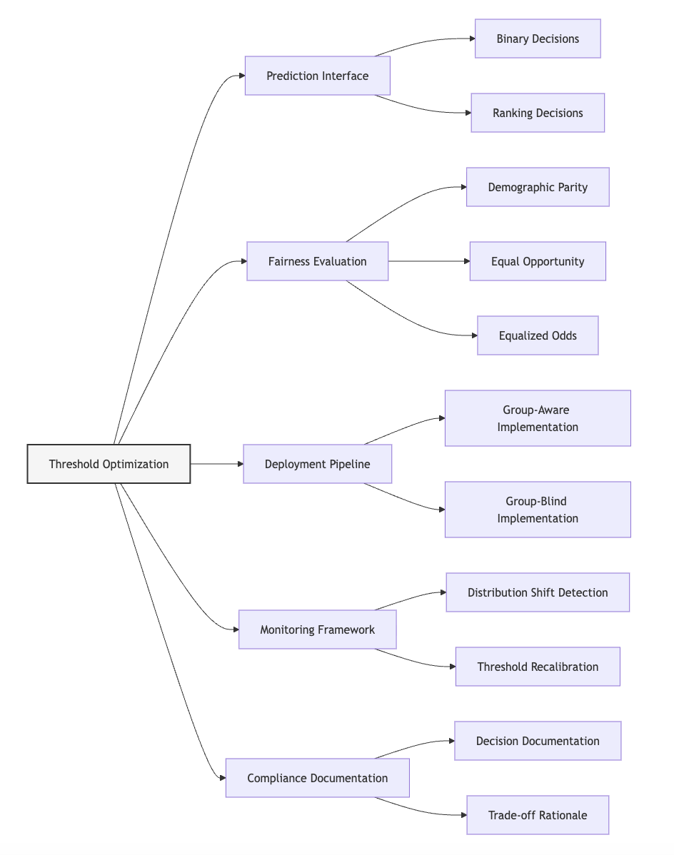 - Deployment Pipeline: Threshold implementations must integrate with production systems, potentially alongside other fairness interventions.