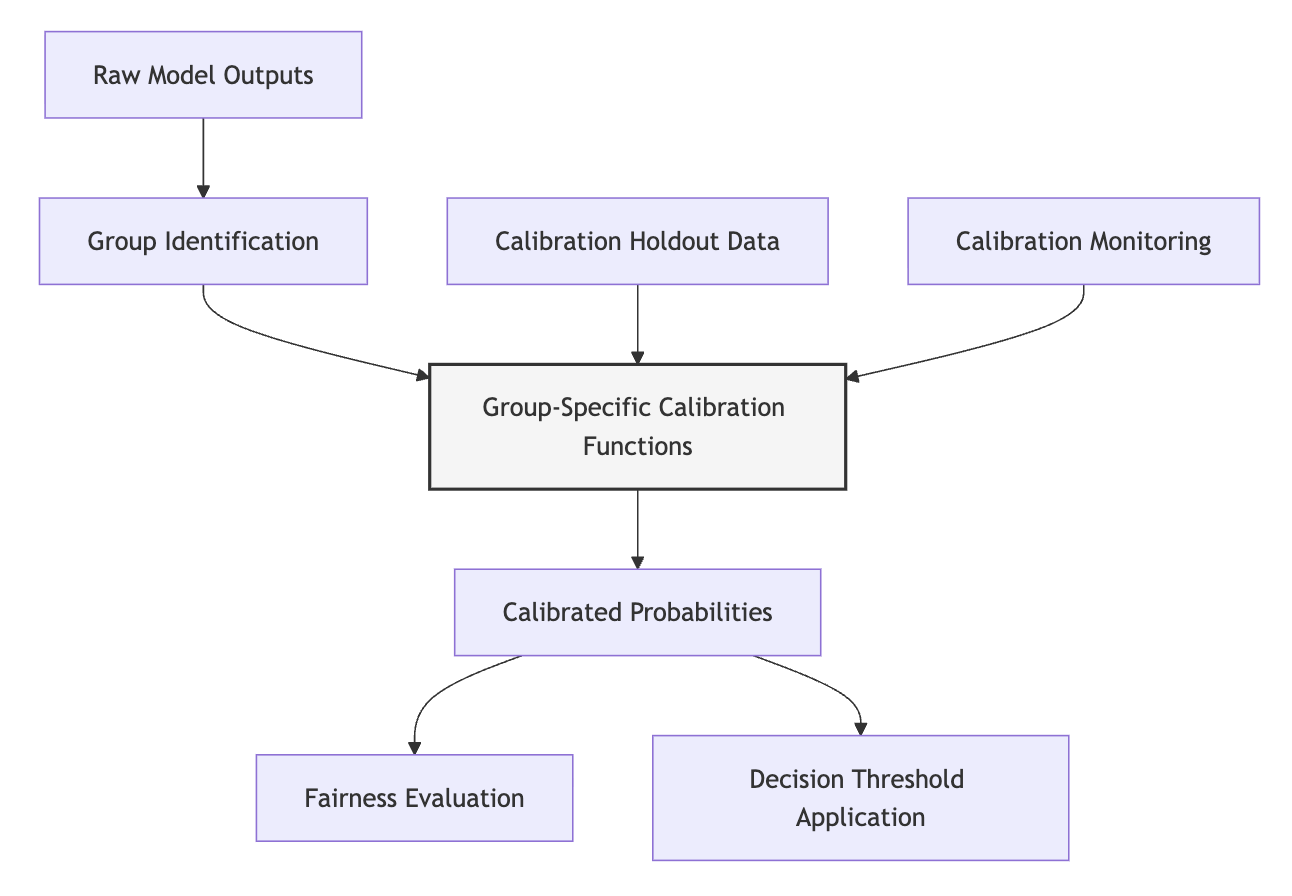Calibration ensures probability estimates mean the same thing across groups. When a credit model says there's a 20% default risk, that probability should reflect reality regardless of the applicant's demographic attributes. Pleiss et al. (2017) demonstrate how miscalibration creates uneven impact when decisions rely on probability thresholds.